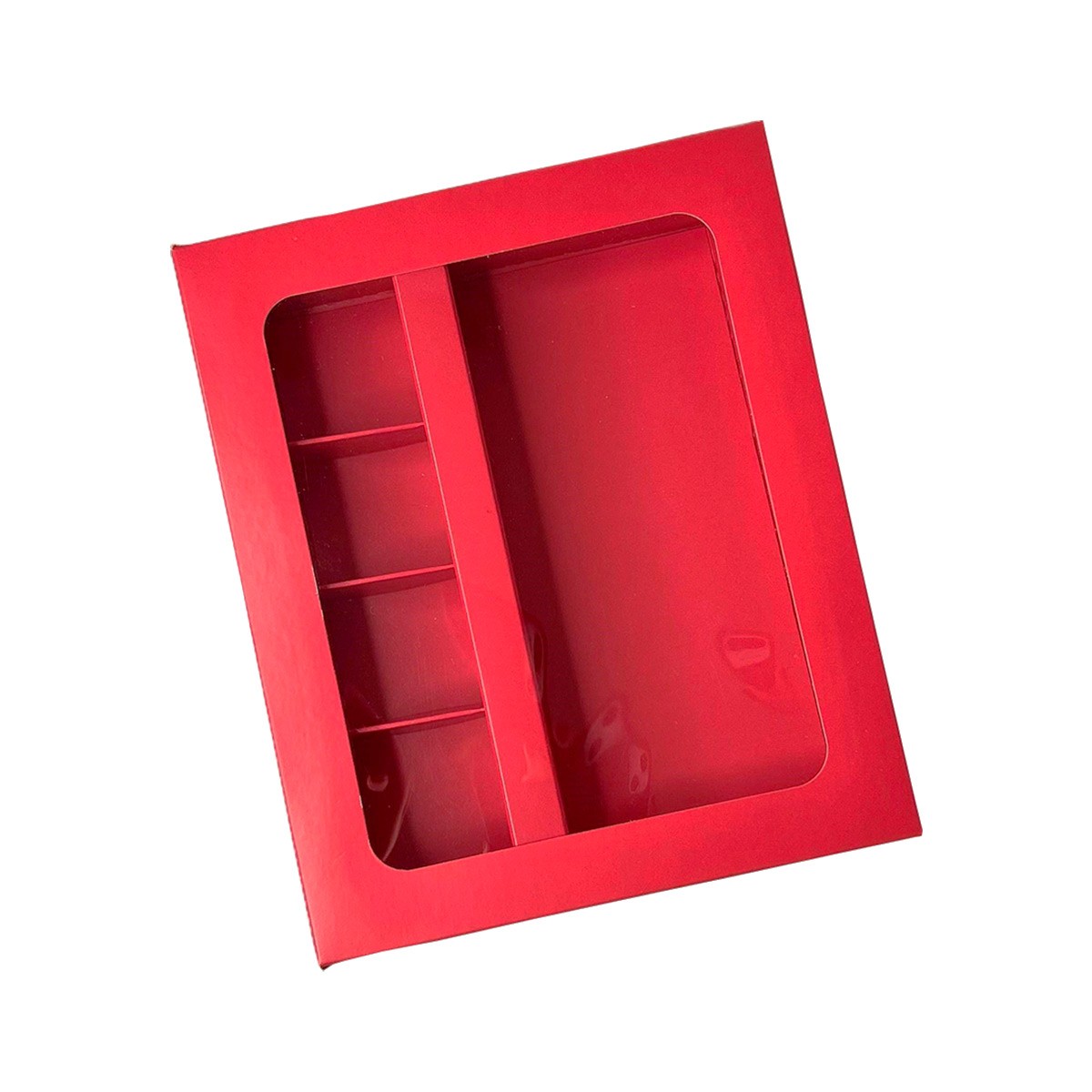 Коробка для 4 конфет + шоколадной плитки Красная с пластиковой крышкой (Россия, 200х165х30 мм+170х8)