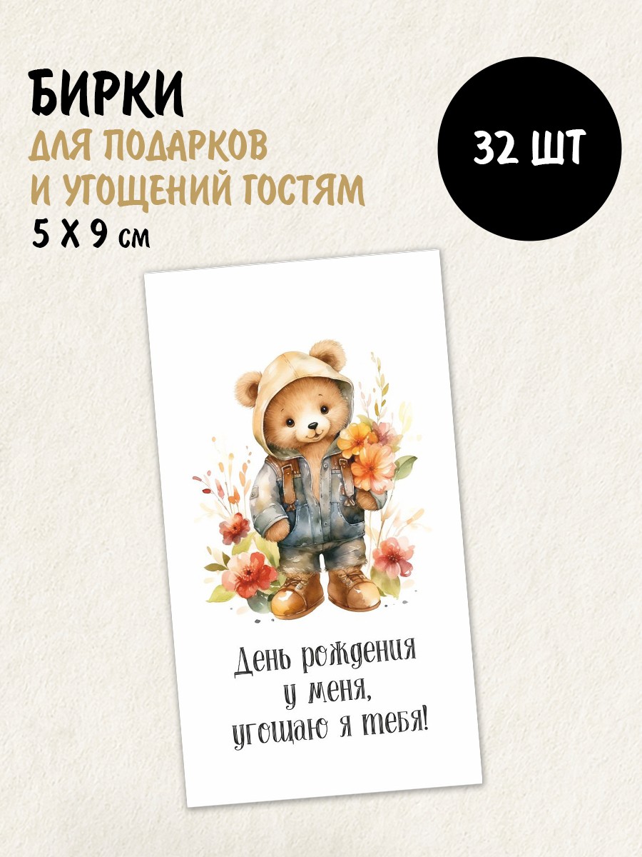 Набор открыток бирок День рождения у меня, мишка (РБ,30шт.,50х90мм)