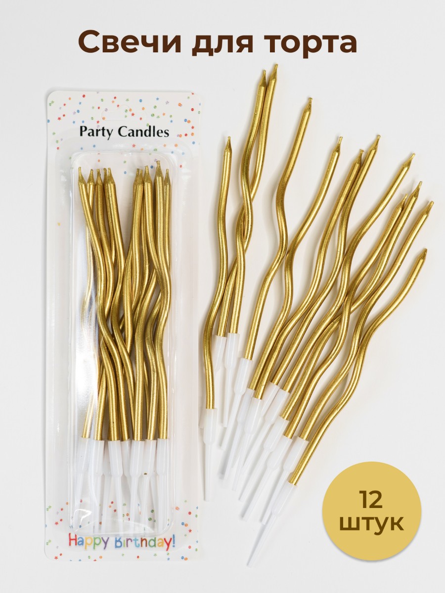 Набор свечей для торта витые, золотые 15 см (Китай, 12 шт)